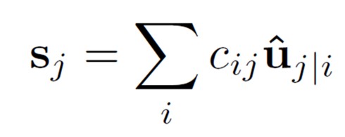 u是上一个胶囊层的输出向量,w是连接两个胶囊层的向量权重,uj|iuj|i 是上一层的神经元经过权重后的预测向量,cijcij是不同层向量元的耦合系数,s为本层的胶囊向量的输入,也是预测向量的加权和,只不过权重变成了耦合