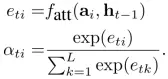 Attention,上文说到zt是LSTM真正的输入,是一个和时间相关的动态变量,不同时间关注在不同的图像区域内,那么这里就可以和attention结合起来,规定特定时间内关注某个区域。实现attention的方式,就是:zt由时间和位置区域决定,对于每个时间的每个区域都定义一个权重值ati。为了满足权重的归一化,我们通过softmax函数实现,如下式,Softmax的输入需要包含位置信息和前一时刻隐层值: