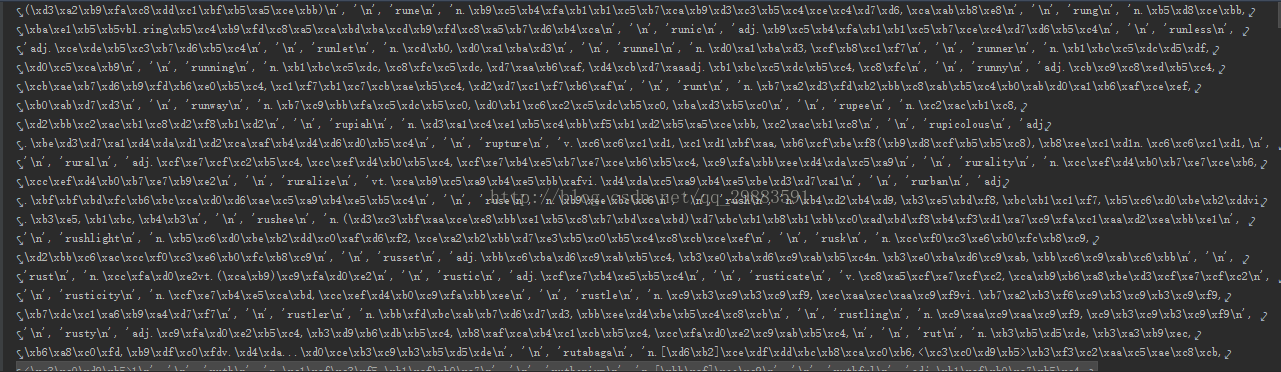 我们随意拿出这句'runletn', 'n.xcdxb0,xd0xa1xbaxd3n', 'n', 'runneln', 'n.xd0xa1xbaxd3,xcfxb8xc1xf7n', 'n',从中可以看出,对于每行的文件,在读取的时候,换行符“n”也是会被读取在单词和对应的解释的后面的,所以这也就是为什么会有那么多空行的原因了,这显然不是我们想要看见的,下面我们处理一下,让这些多余的空行失去效果: