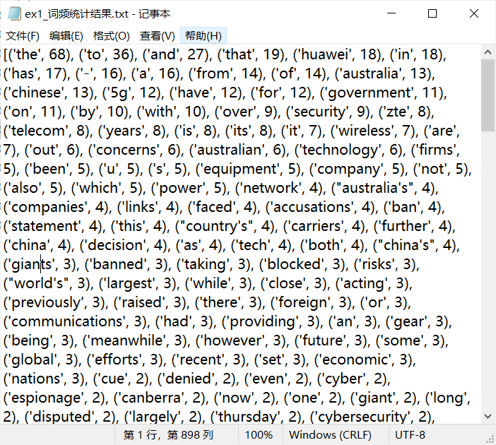 (1)具体词频统计见附件ex1_词频统计结果.xlsx和ex1_词频统计结果.txt。第一个文件为自己编写的代码,在存储结果的时候对数据进行了一些处理,里面的数据较为规范;第二个文件参考老师讲解,之后在存储文件时采用了列表格式存储。