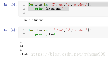 python中的for循环和传统for循环不太一样,可以接受迭代对象作为其参数,每一次迭代其中的一个元素。在python3中,用print进行打印时,用end='' 等号右边的格式根据自己的喜好指定,不指定的情况下默认换行显示。图中第一个是以空格分隔,显示一行。