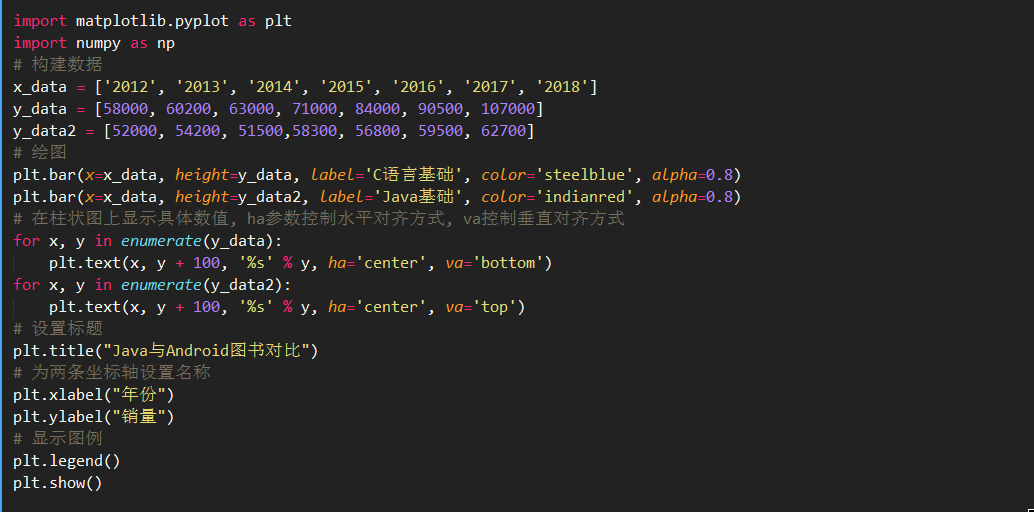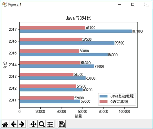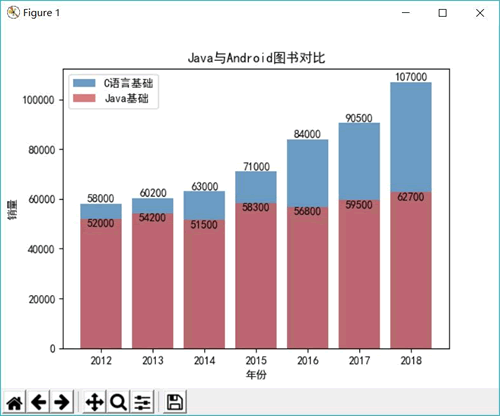 下面程序使用柱状图来展示《C语言基础》和《Java基础》两套教程历年的销量数据。