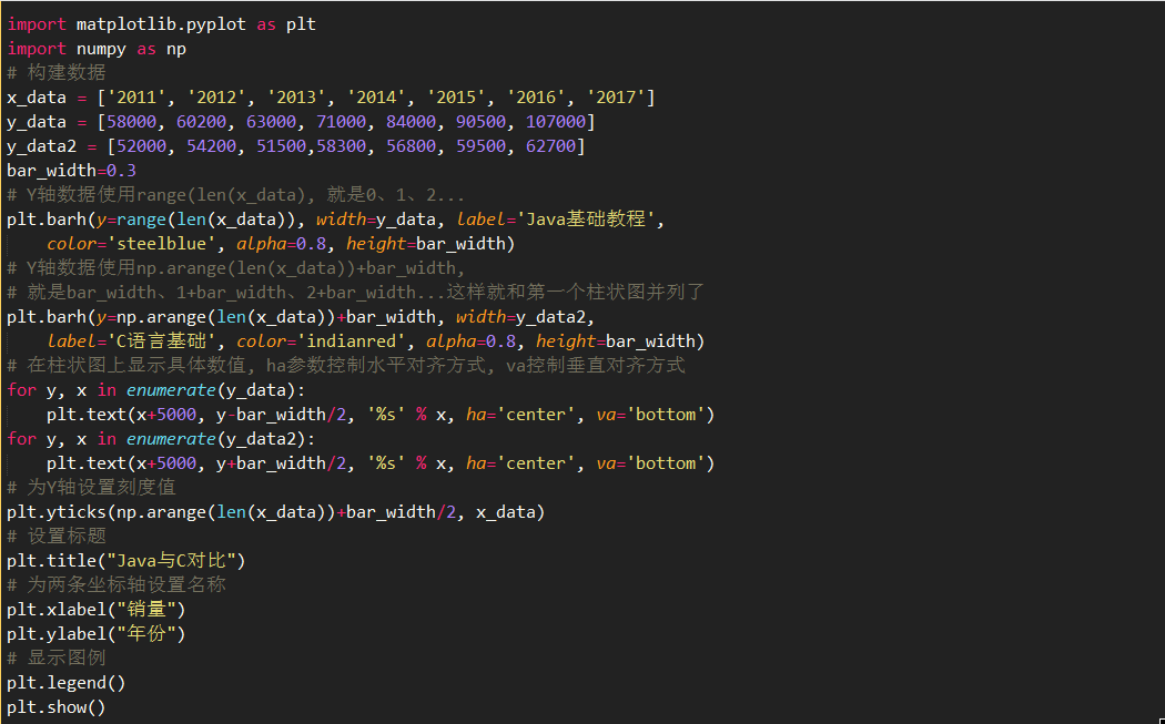 例如,如下程序调用 barh() 函数生成两组并列的水平柱状图,来展示两套教程历年的销量统计数据: