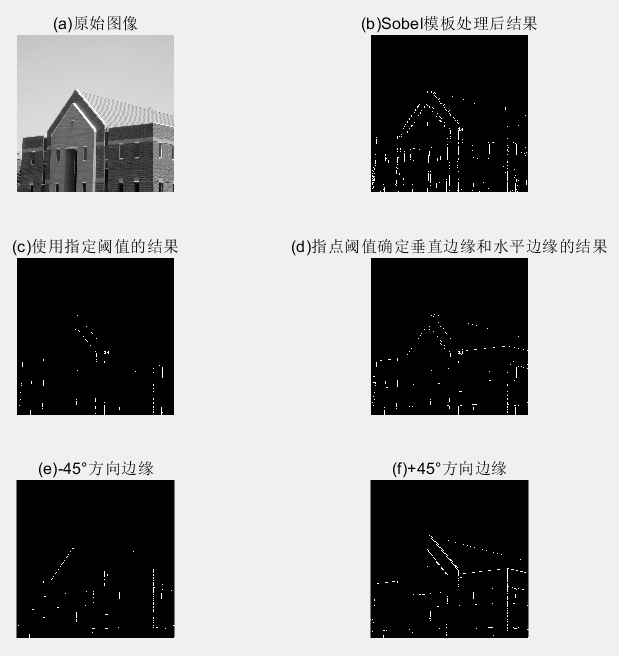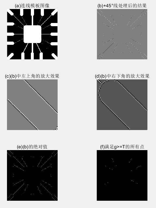 - 图(e)显示了图(b)的绝对值。因为我们对最强的响应感兴趣,所以令 T等于图像中的最大值。图 (f)以白色显示了满足条件g>=T的点,其中的 g是图(e)中的图像。