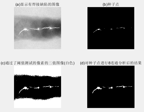 - 用函数imextendedmin来得到内部标记符的集合,最后将灰斑点的最小区域位置叠加在原始图像上,如图©所示。可以看到,得到的斑点的确很合理地标记了我们想要分割的物体。