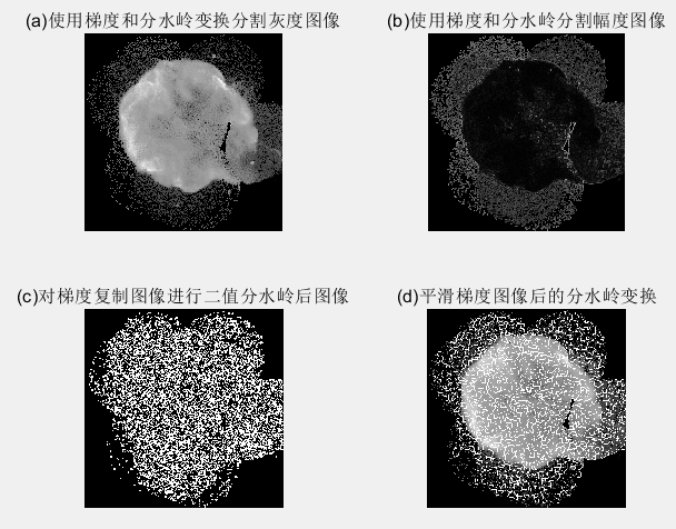 title('(a)使用梯度和分水岭变换分割灰度图像');