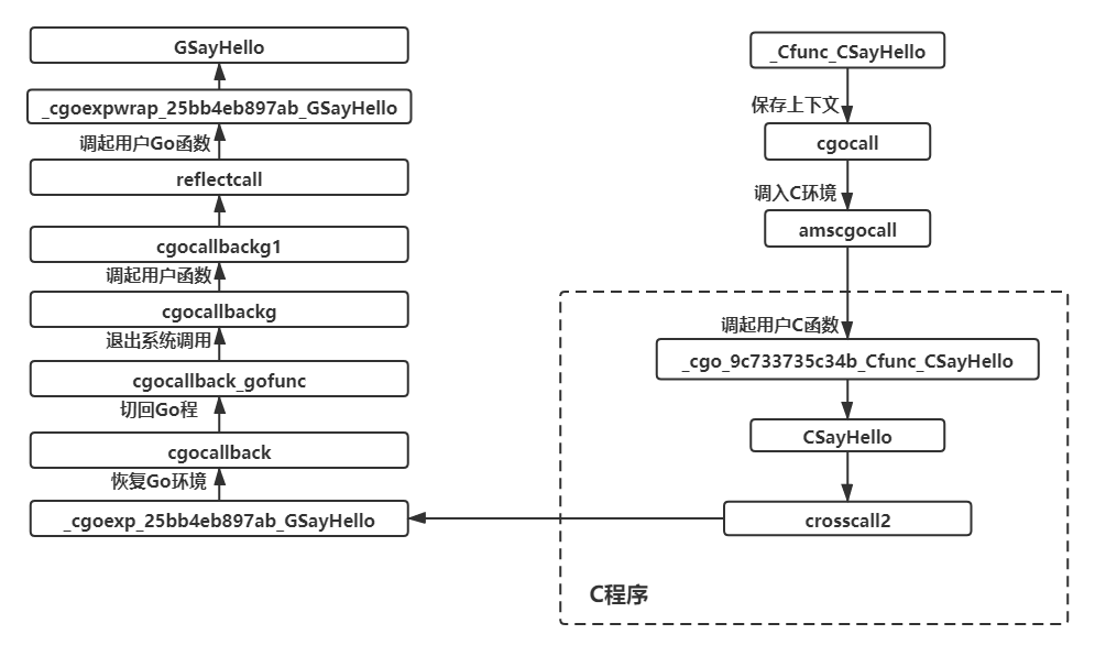 Go程序先调用C的SayHello接口,由于SayHello接口链接在Go的实现上,又调到Go。