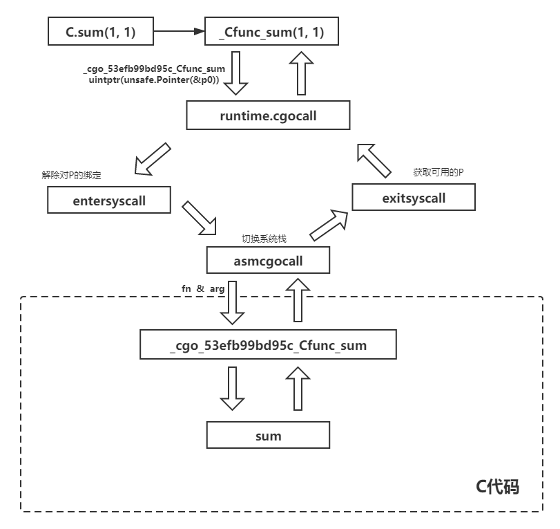 直接将完整的C代码放在Go源文件中,这种编排方式便于开发人员快速在C代码和Go代码间进行切换。