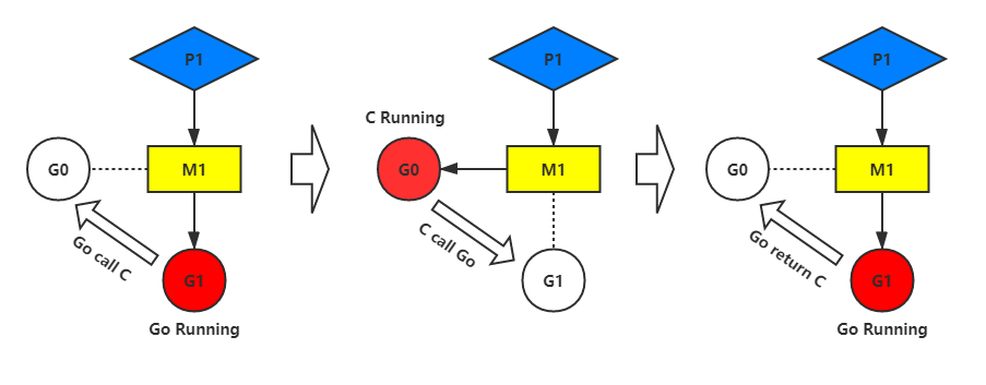 C函数调入进Go,必须按照Go的规则执行,当主程序是C调用Go时,也同样有一个Go的runtime与C程序并行执行。这个runtime的初始化在对应的c-shared的库加载时就会执行。因此,在进程启动时就有两个线程执行,一个C的,一 (多)个是Go的。