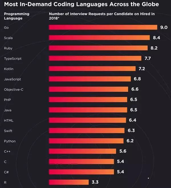 此外,惹人注意的还有Go。可能有小伙伴会说Golang糟糕透了,谁用谁白痴……但查看Hired网站发布的《2018年软件工程师现状》报告会发现,全球需求量最多的不是Python,不是Java,不是C/C++,更不是PHP,而是它-Golang。
