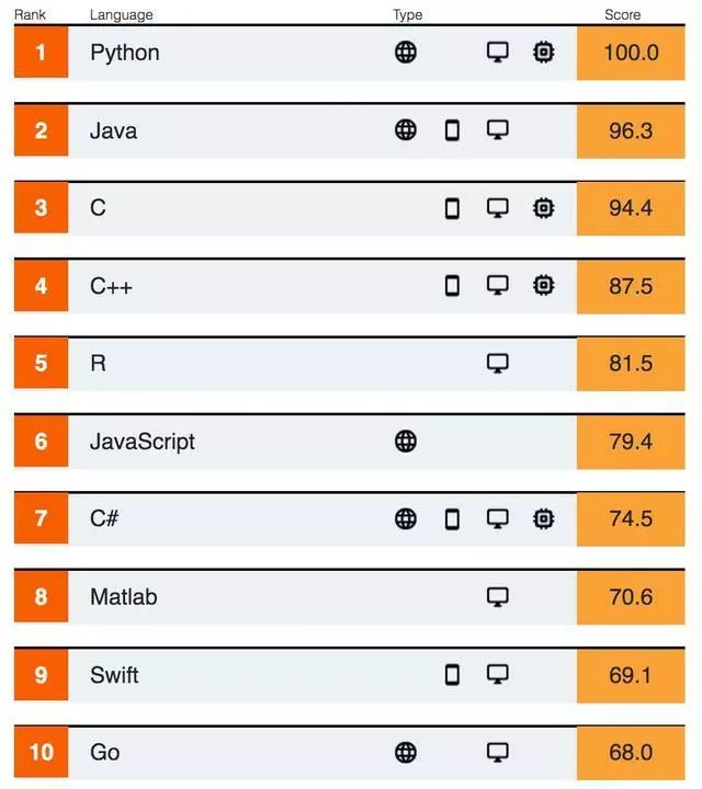 其次,较为引人注意的便是Java、C/C++,Java以3.7%的微弱劣势败给Python,C语言则以94.4%保住第三的宝座,而C++以低于Python12.5%的速度进入人们的视野。R用于统计分析和绘图的语言及操作环境,以81.5%挤进前五。近几年因不断增长的海量数据,使得R语言长期保持良好的受欢迎程度。