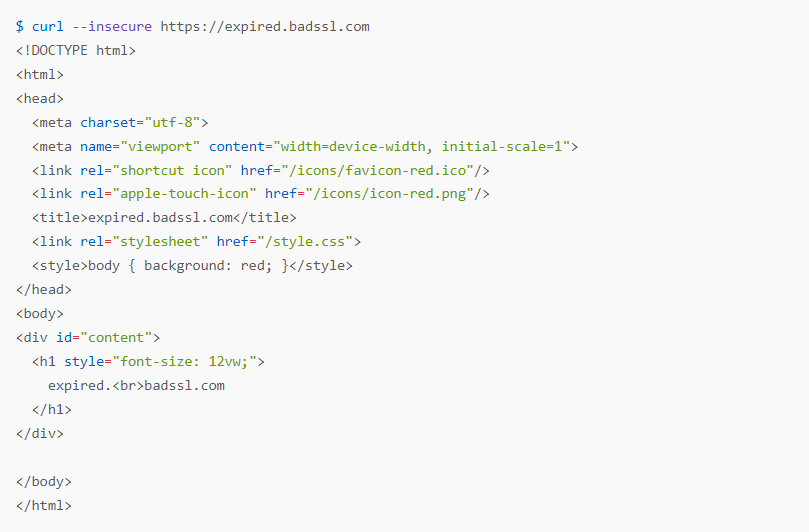 $ wget --no-check-certificate https://expired.badssl.com --2022-11-17 15:18:07-- https://expired.badssl.com/ Resolving expired.badssl.com (expired.badssl.com)... 104.154.89.105 Connecting to expired.badssl.com (expired.badssl.com)|104.154.89.105|:443... connected. WARNING: cannot verify expired.badssl.com's certificate, issued by ‘CN=COMODO RSA Domain Validation Secure Server CA,O=COMODO CA Limited,L=Salford,ST=Greater Manchester,C=GB’: Issued certificate has expired. HTTP request sent, awaiting response... 200 OK Length: 494 [text/html] Saving to: ‘index.html.1’ index.html.1 100%[===================>] 494 --.-KB/s in 0s 2022-11-17 15:18:08 (209 MB/s) - ‘index.html.1’ saved [494/494]