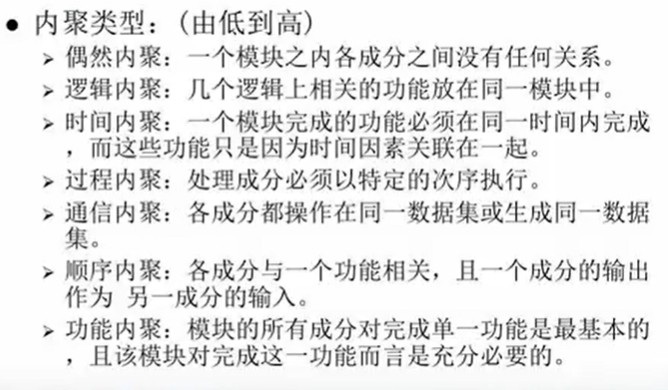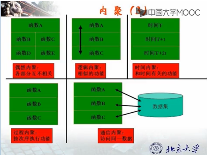 内聚:一个模块之类各成分之间相互依赖程度的度量;