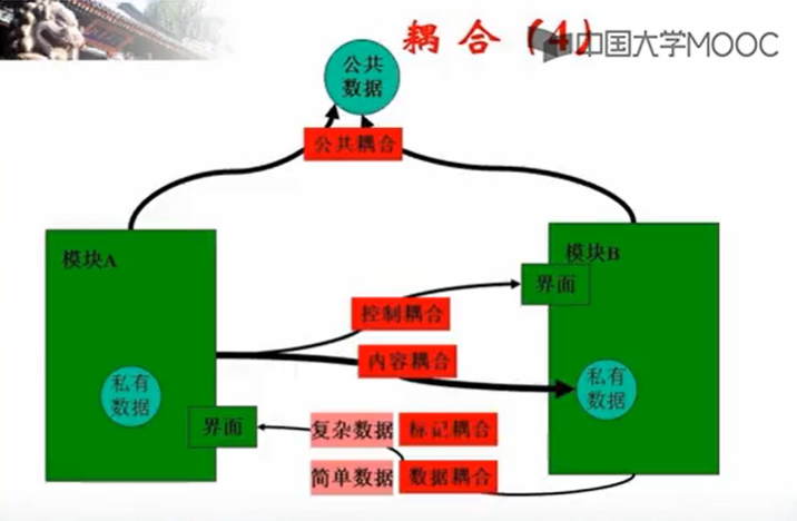 耦合的定义:不同模块之间相互依赖程度的度量;耦合的强度依赖于:一个模块对另一个的引用;传递的数据量、施加控制的数量、模块之间...