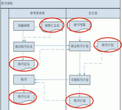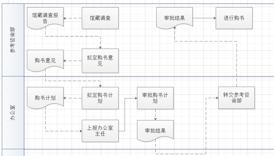 例1:参考咨询部首先进行馆藏调查,在此基础上拟定购书意见报办公室,办公室在参考咨询部的购书意见基础上拟定购书计划,上报办公室主任审批,将审批结果转交参考咨询部,参考咨询部再进行购书活动,请画出业务流程图。
