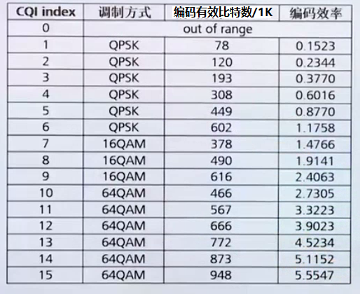 对于同一种调制方式,对应多种码率。比如CQI = 1~6,调制方式都是QPSK,但码率越来越高,通过这样的细分保证调度灵活性。