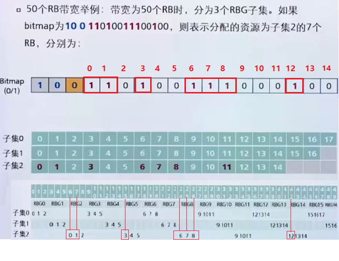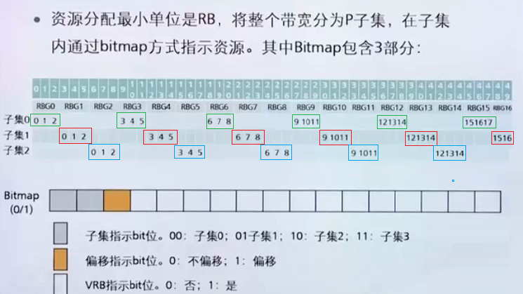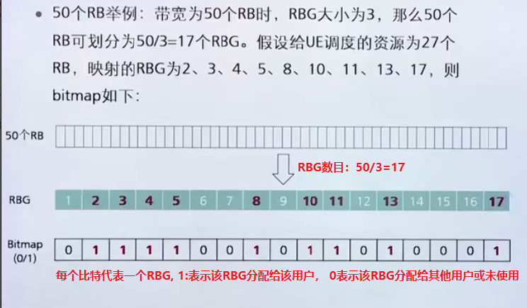 - 手机端通过bitmap映射和bitmap的0和1的设置,就可以知道,哪些RBG是分配给自己的RB资源。也就是说,基站通过bitmap的方式,通知基站给UE进行的资源分配结果。