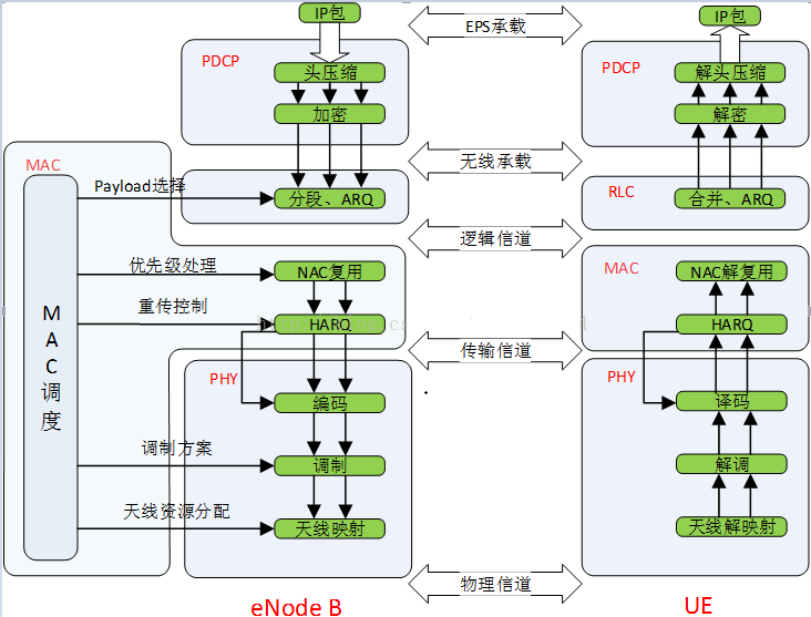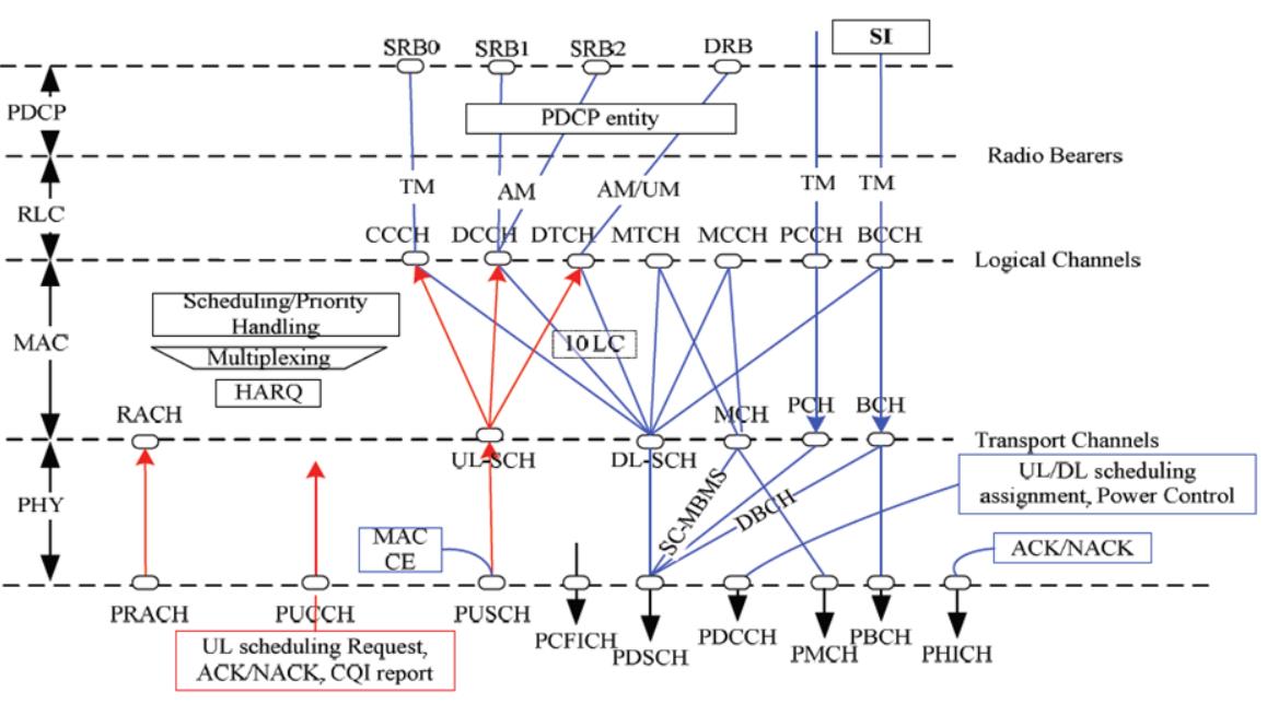 (4)由于信道简化、信道职能加强,映射关系变得更加清晰,传输信道DL/UL-SCH功能强大,物理信道PUSCH、PDSCH比UMTS干活的信道增强了很多。