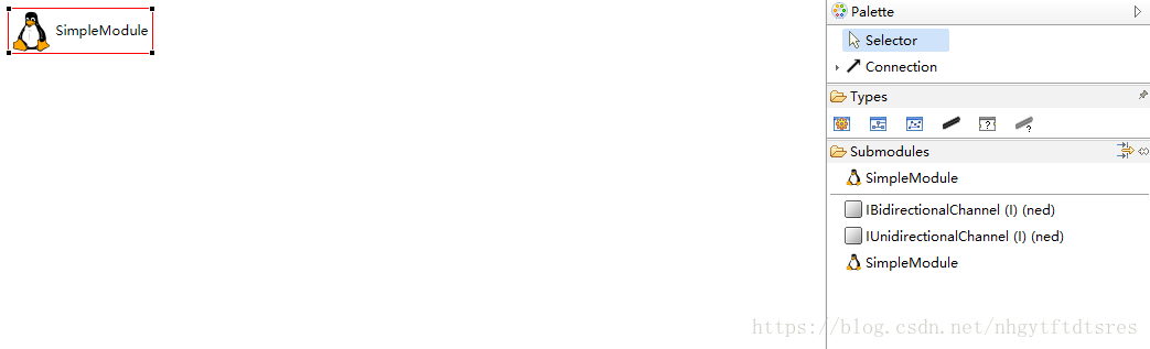 双击SimpleNetwork.ned模块,在Types中选择第一个(Simple Module--Create a simple module type)在左边生成一个简单模块,并右键修改名字SimpleModule和相应属性,点击在文本框右下角的Source,在文件中写入如下内容: