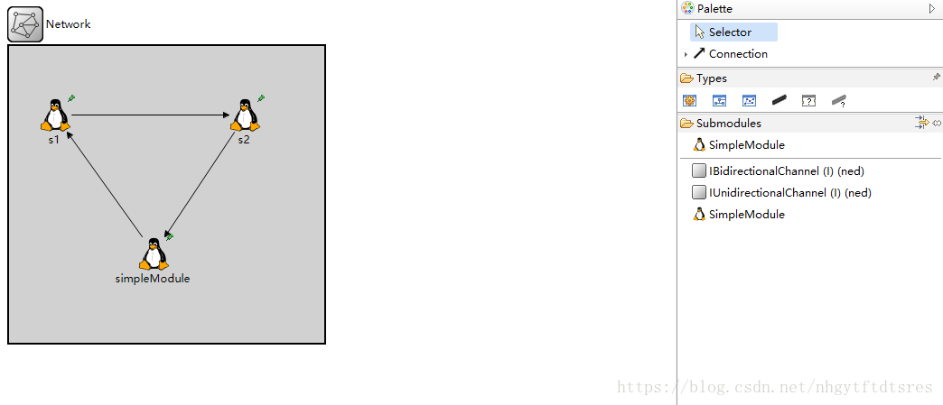 项目点击右键new-->Network description Files建立network.ned文件,在Types中选择第三个Network在左侧生成Network,同样右键属性修改相应内容,如名字,并将左侧在2.1生成的简单模块拖入network中右键属性修改模块名称,点击左侧Connection,连接各个模块,得到如下网络结构: