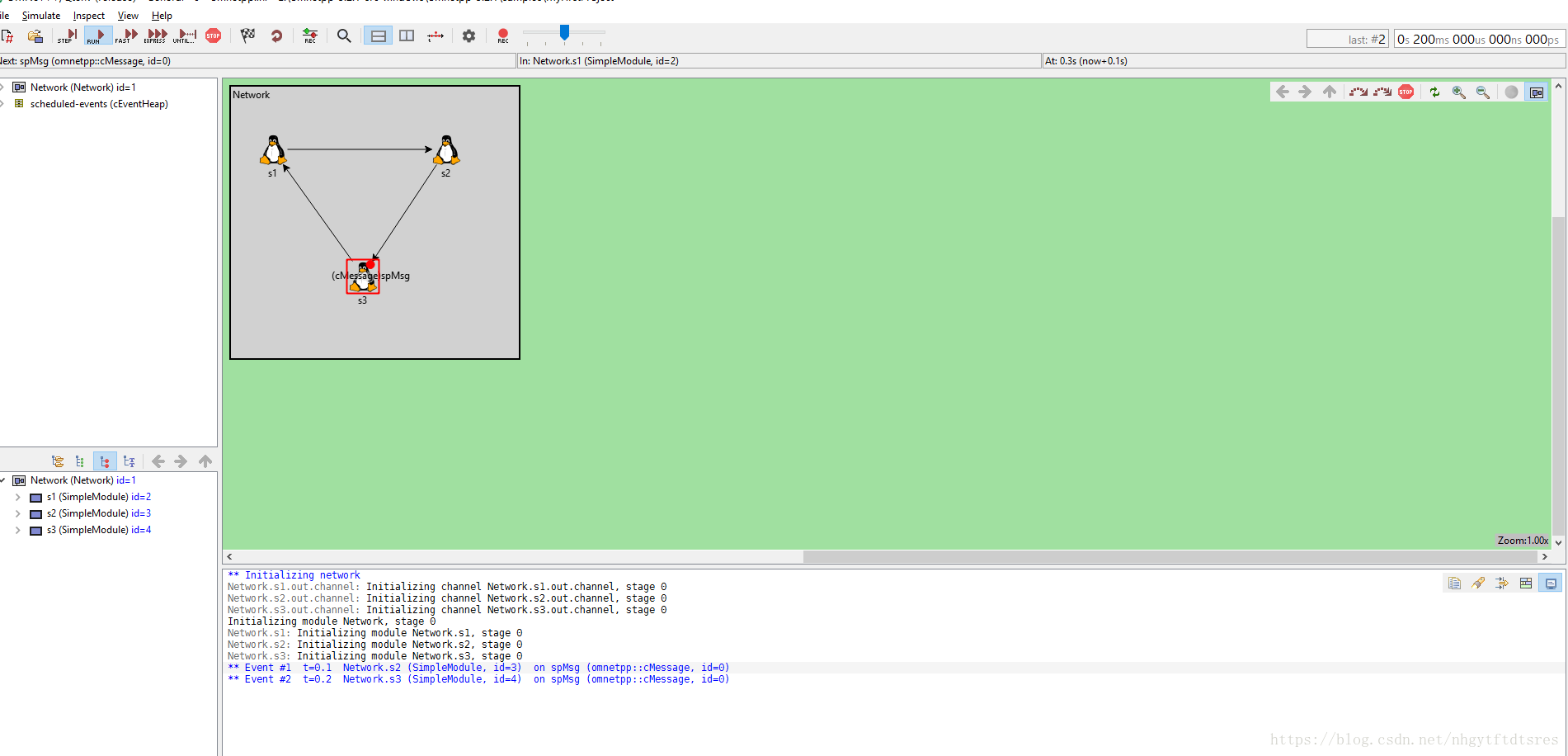 在initialize()中的if条件语句表达式含义为在初始化过程中,当该模块名字为s1时,就要生成消息msg,并通过函数send()将该消息通过发送门out发送出去;