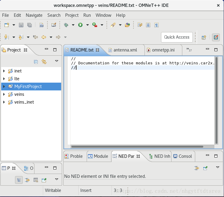 点击左上角 File-->New-->OMNET++ Project填写项目名字(Project name):MyFirstProject,点击next选择Empty project-->finish,这样在左侧Project Explorer 就会出现MyFirstProject项目;