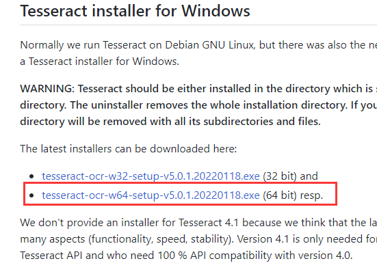 方式1,到tesseract官网下载dll和字库,tesseract官网提供源码和编译好的DLL,建议直接使用编译好的DLL,方便省时。以下是64位DLL安装包下载地址:https://github.com/UB-Mannheim/tesseract/wiki