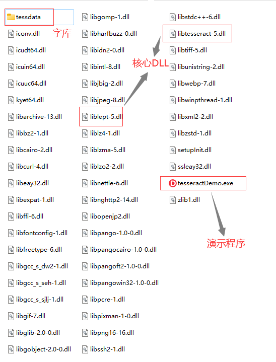 Tesseract API主要DLL文件为liblept-5.dll 和 libtesseract-5.dll,其他的是大量的加载图片使用的DLL,tessdata为字库,如下图: