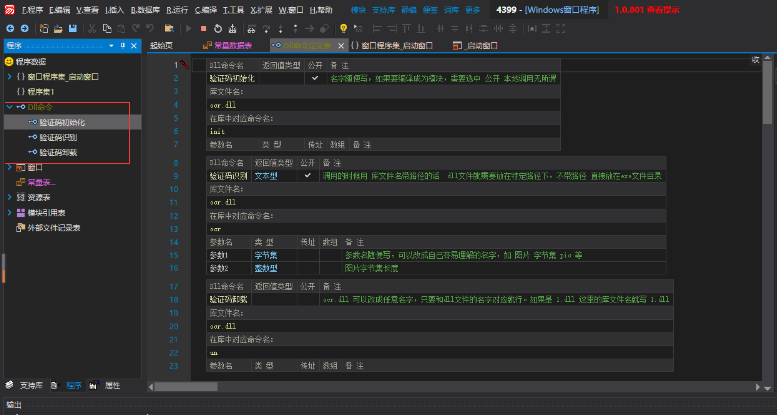 .DLL命令 验证码初始化, , "ocr.dll", "init", 公开, 名字随便写,如果要编译成为模块,需要选中 公开 本地调用无所谓