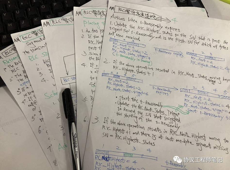 若既没有详细解析RLC的书籍/资料,又没有实践机会(开发RLC和处理bug),怎样的学习方式比较高效?我最初看LTE RLC协议亦是剪不断理还乱,因为状态变量(State Variables)太多,而且名字全然不具备启发性,比如AM接收变量VR(MR), VR(MS), VR(R), VR(X), VR(H), 光是看到这5个‘VR’就已晕头转向,勿论混杂这些变量(通常还结合几个定时器)的各种处理了!NR有所改善:变量名具备一定启发性了(比如,将LTE的VR(X)改成了RX_Next_Status_Trigger),但是光看不动手,仍会被那些处理流程弄得一头雾水,因此我试图在阅读RLC协议时边看边根据协议处理流程在纸上画出对应的收发包实例,如下图,这样理解就稍微深一点: