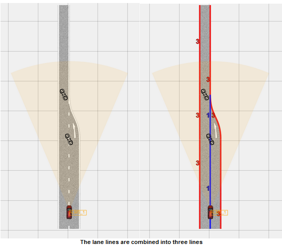 传感器只考虑FOV内的车道线部分,多次穿过FOV的线被视为单独的线。但是,在预扫描中设置的车道线标签将为检测到的线保留,并且也将显示在输出中(即车道标签的重要性)。