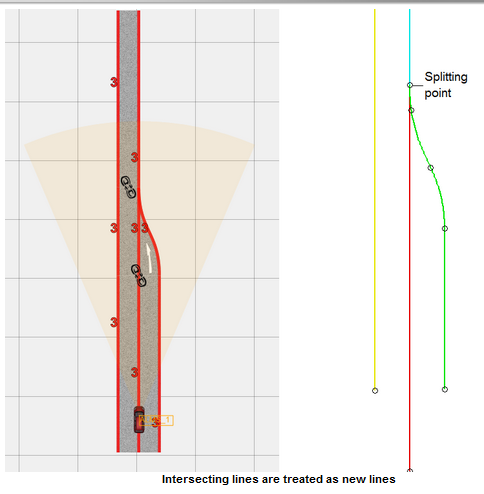 一条延伸到几个路段的车道线将被视为一条线;不同路段的车道线的一部分,如果它们连接在一起,并且线的标签匹配,则被合并成线。然而,如果两条或更多具有相同车道标签值的车道线有交集,那么这些车道线将被分割成新的线条,全部以交集点为终点。以下图为例进行说明,图中有3条线(使用默认标签),需要拟合3条线: