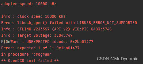 多次查阅相关资料说是识别到的为国产同类型芯片,应该强制更改.cfg文件中相关idcode。但相信大疆不可能使用其他Chips替代高性能STM32芯片,且此操作并没有解决相关问题。因此继续寻找问题所在。