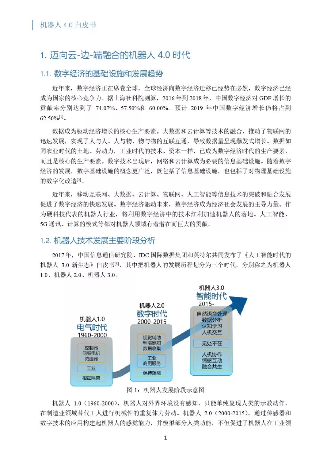 2017年,中国信息通信研究院、IDC 国际数据集团和英特尔共同发布了《人工智能时代的机器人 3.0 新生态》白皮书,其中把机器人的发展历程划分为三个时代,分别称之为机器人1.0、机器人 2.0、机器人 3.0。