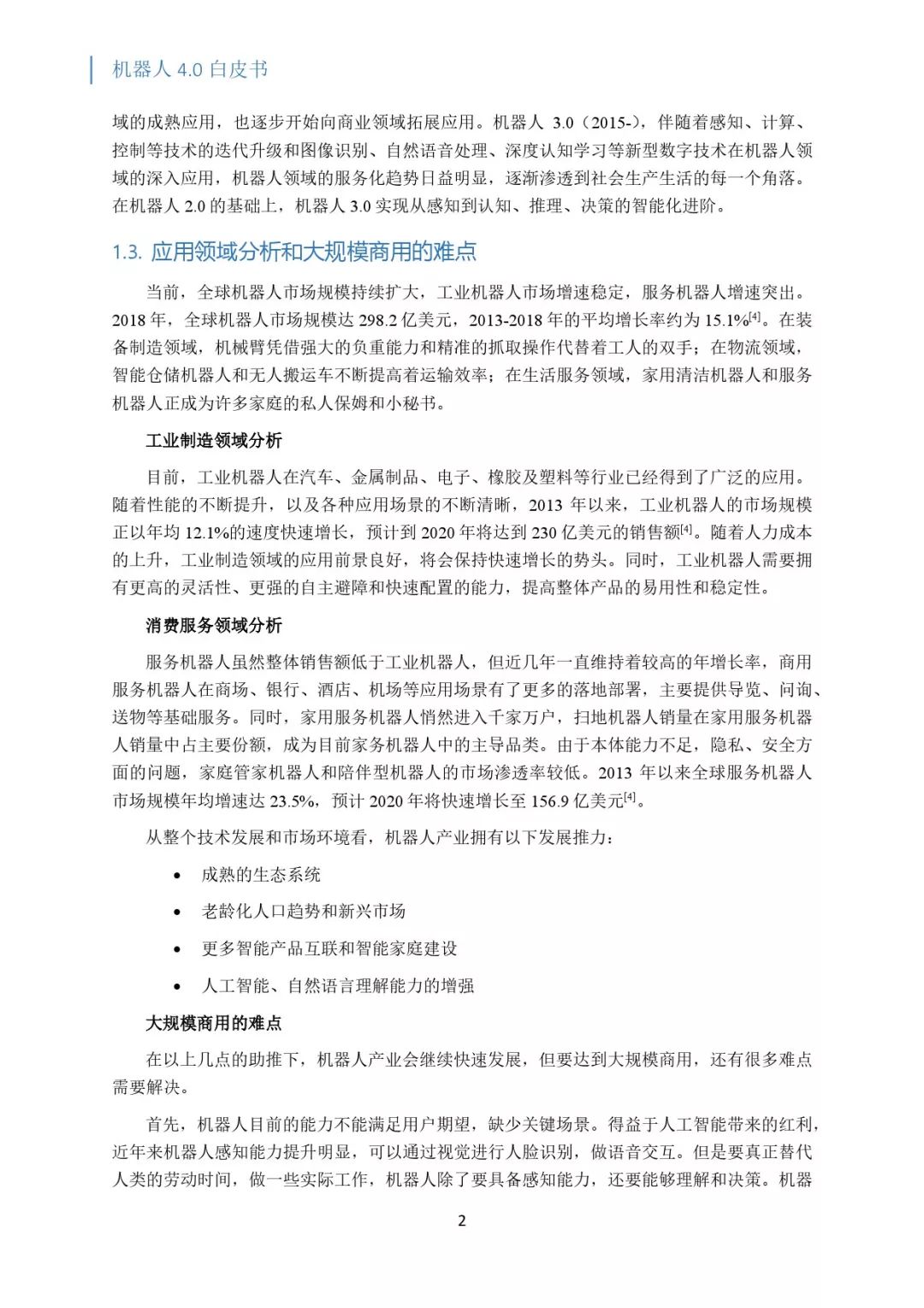 服务机器人虽然整体销售额低于工业机器人,但近几年一直维持着较高的年增长率,商用服务机器人在商场、银行、酒店、机场等应用场景有了更多的落地部署,主要提供导览、问询、送物等基础服务。同时,家用服务机器人悄然进入千家万户,扫地机器人销量在家用服务机器人销量中占主要份额,成为目前家务机器人中的主导品类。由于本体能力不足,隐私、安全方面的问题,家庭管家机器人和陪伴型机器人的市场渗透率较低。2013 年以来全球服务机器人市场规模年均增速达 23.5%,预计 2020 年将快速增长至 156.9 亿美元。从整个技术发展和市场环境看,机器人产业拥有以下发展推力: