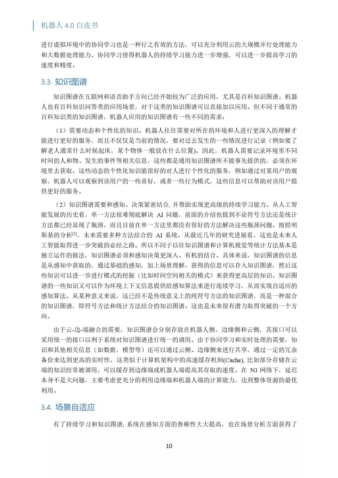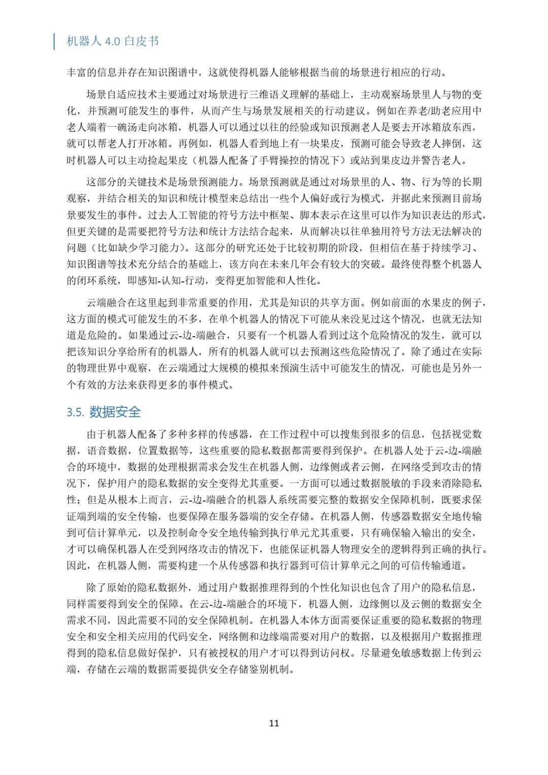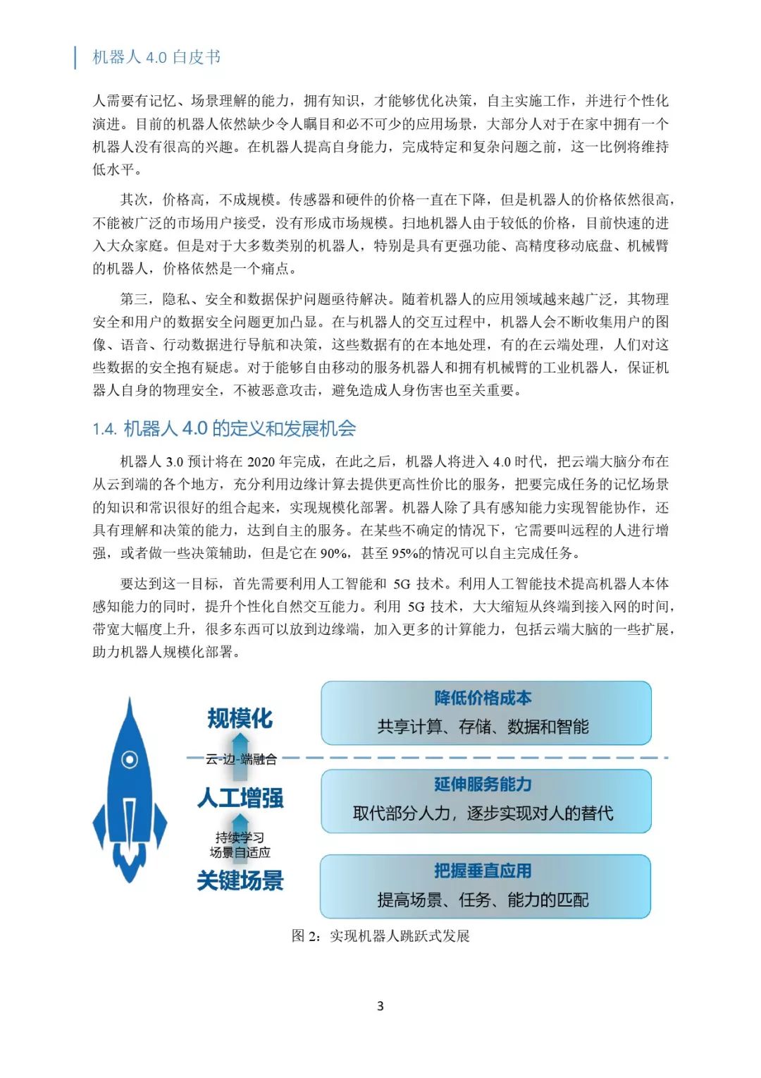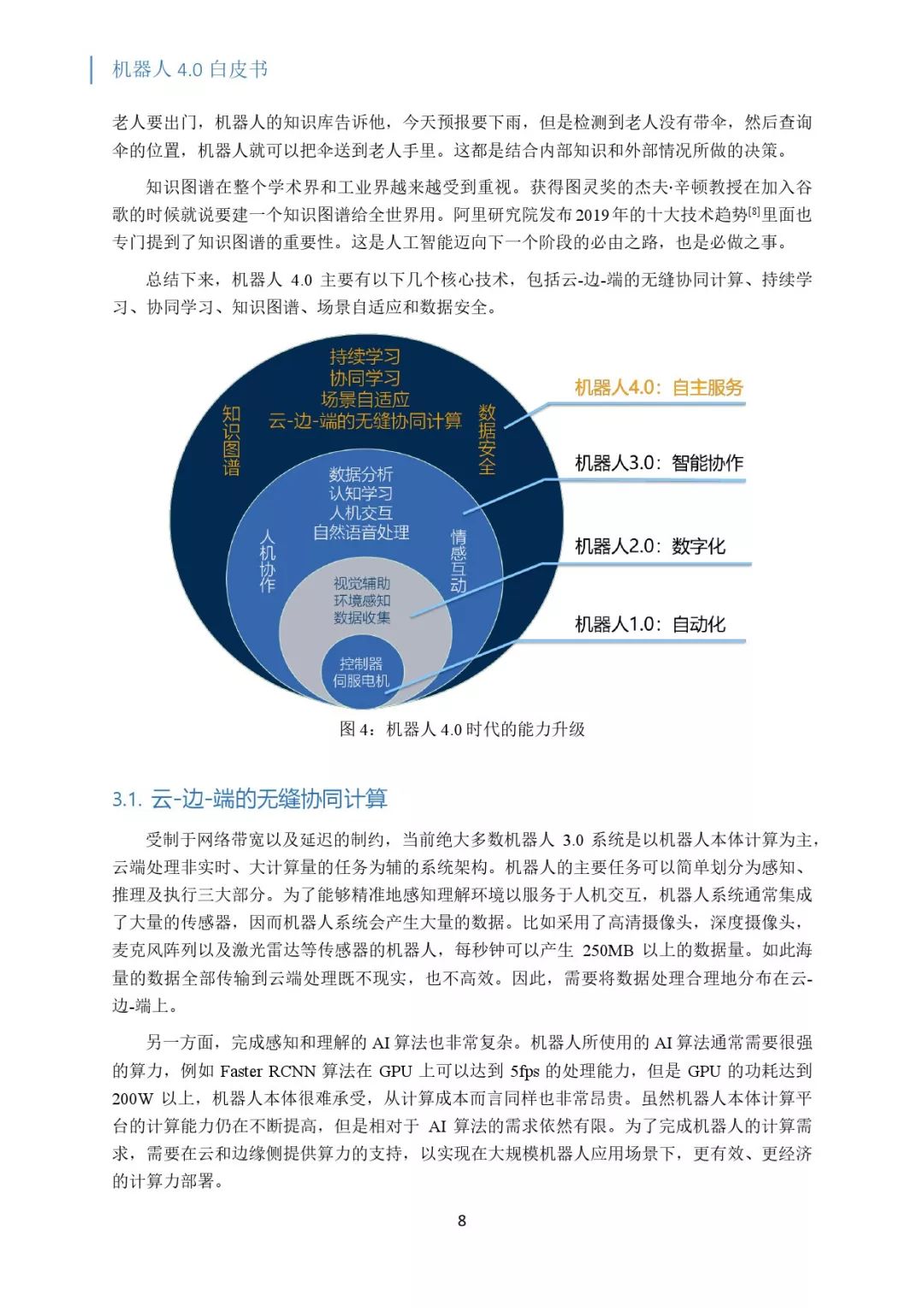 机器人 3.0 预计将在 2020 年完成,在此之后,机器人将进入 4.0 时代,把云端大脑分布在从云到端的各个地方,充分利用边缘计算去提供更高性价比的服务,把要完成任务的记忆场景的知识和常识很好的组合起来,实现规模化部署。