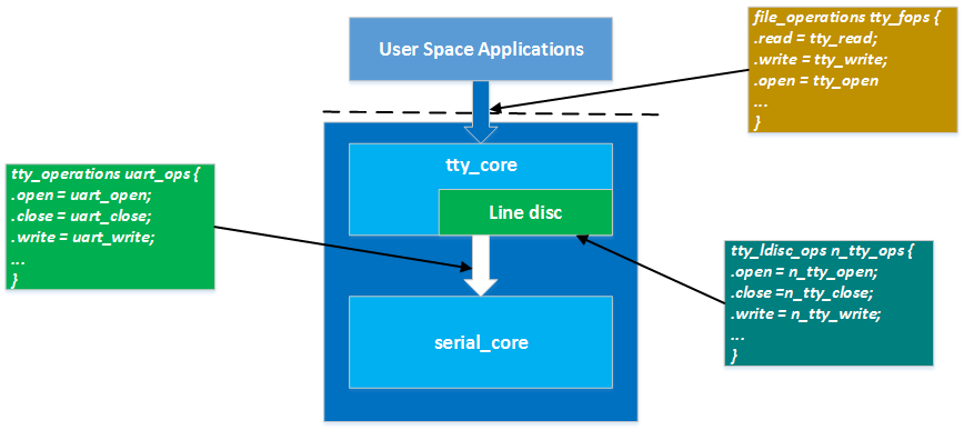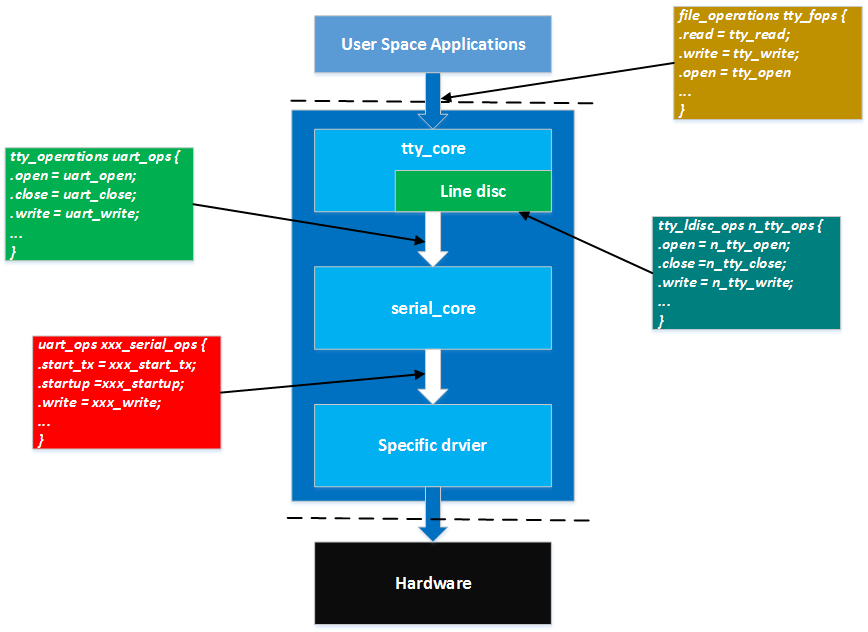 在上一章节中,从芯片对接 Kernel 的角度上来描述了我们需要设计和实现的结构以及调用的接口,这些毕竟是最底层的内容,Linux Kernel 中,串口驱动的代码,将它们注册进了 tty 核心层,本文从应用的角度上来说明 tty 层是如何起到上面对应应用程序,下面对接到实际的串口驱动的。内容涉及到 tty core 层以及 tty 线路规程部分。