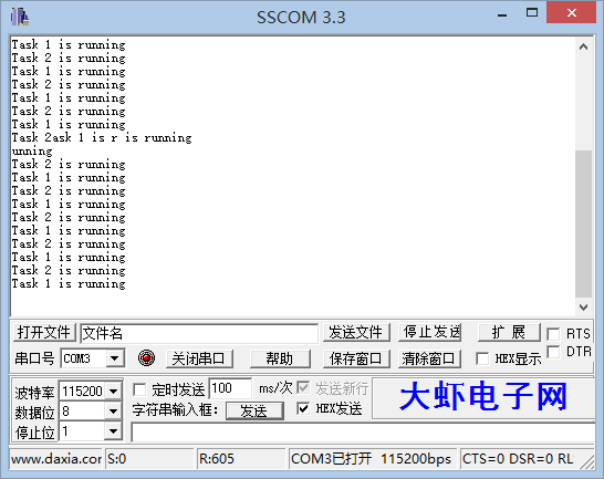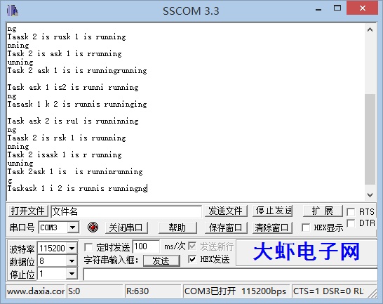 不难看出输出结果未达到预期,这是因为时间片长度太短,以致在一个时间片长度内未能输出全部字符串便被另一个任务所打断,参考《FreeRTOS实时内核使用指南》第17页的相关内容,不妨将configTICK_RATE_HZ设为100(HZ),效果如下图所示: