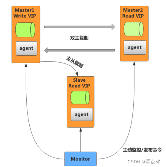 - agent:运行在每个 MySQL 服务器上的代理进程,monitor 命令的执行者,完成监控的探针工作和具体服务设置,例如设置 VIP(虚拟IP)、指向新同步节点