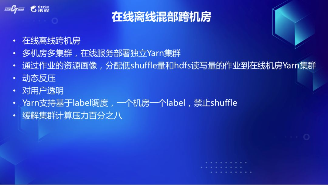 另外由于在线集群也跨了两个机房,我们在FairScheduler上开发了基于label的调度,一个label对应一个机房,会根据每个label的负载,动态分配作业到所属的label,一个app所有的task只会固定在一个label内执行,这样机房间不会产生shuffle流量。该方案上线后,可以缓解离线集群8%的计算压力。