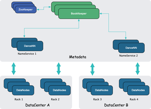 注:由于 BookKeeper 自身的架构设计,NameNode(DanceNN)实际上是需要通过 ZooKeeper 去发现 BookKeeper 的 endpoint 信息的,这里为了方便理解,没有把这部分通信关系画出来。