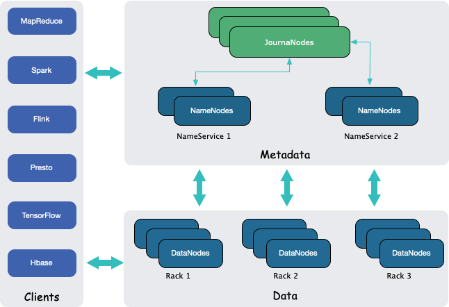 Client:访问 HDFS 的 client,主要通过 HDFS SDK 和 HDFS 进行交互,HDFS SDK 的实现比较重,很多 IO 处理逻辑都是在 SDK 实现,因此这里单独列为架构的一部分。
