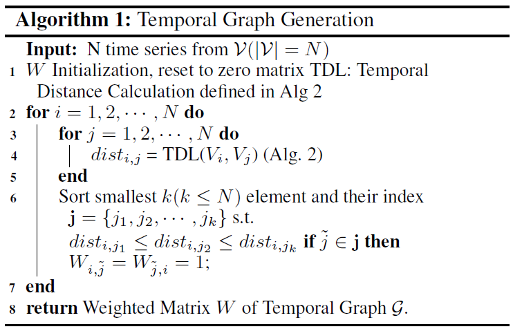 在这里,作者希望利用DTW算法来计算每个节点时间序列的相关性。DTW算法是计算序列相关性的经典算法,但是利用DTW算法具有的时间复杂度。为了降低DTW的复杂度,论文中限制了它的“搜索长度”T为12个时间步。时间图的具体生成过程如图 4所示,其中k的经验取值为令