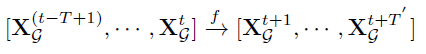 表示t时刻节点的观测数据,则本文中的问题定义为学习一个函数f,对于参考时刻t,该函数通过包含时刻t在内的前T个时刻的观测数据,来预测t时刻后的