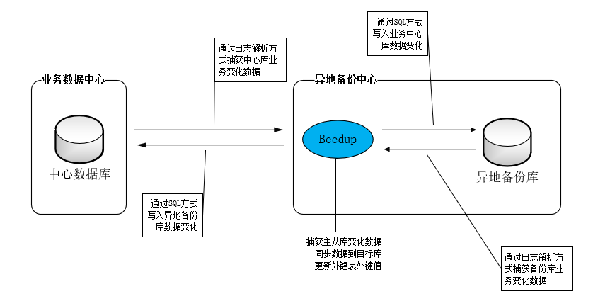 在异地备份中心部署北京灵蜂Beedup数据库复制软件,软件采用日志解析方式捕获数据库变化数据,并将变化数据同步到目标库,实时保持数据库数据一致。