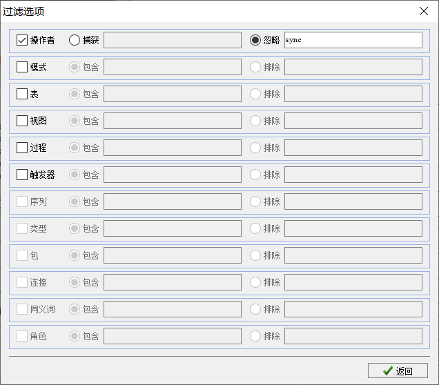 选择[过滤]按钮,在[过滤选项]对话框设置忽略用户sync。