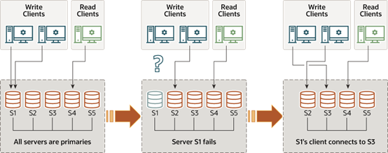 高灵活性,有单主模式(图1)和多主模式(图2),单主模式下,会自动选主,所有更新操作都在主上进行;多主模式下,所有server都可以同时处理更新操作。