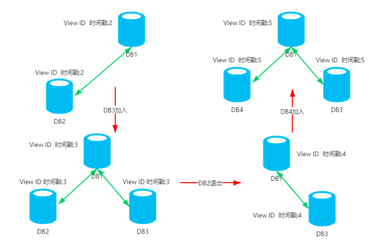 组复制以组视图(Group View,后续简称视图)为基础来进行成员管理,视图一般在Group在一段时间内的成员状态,如果这段时间没有成员变化,也就是说没有成员的加入和退出,一旦有成员加入或者退出组,则视图就发生变化,并且使用视图ID(view id)进行跟踪变化区分先后时间,下面我们来看一张图演示一下: