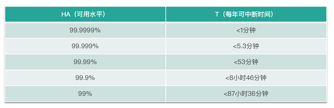 根据 HA 计算的值,业务常用的描述方法是“系统的可用性达到几个 9“。这“几个 9“就表示可用水平,正如下图所示,9 越多意味着可用性越高。常说的“5 个 9“意味着系统每年故障时间小于 5.3 分钟,其计算方式也很简单:系统 1 年内服务中断维护了 5 分钟,HA = 1 年/(1 年+5 分钟) = 99.999% 。