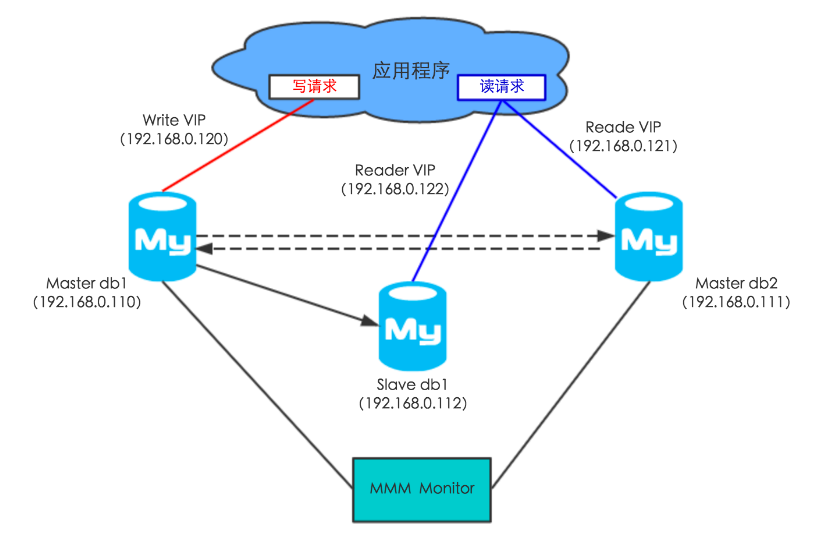 从下图中可以看到,数据库集群节点各绑定了一个 VIP,VIP 赋有读节点、写节点的逻辑概念,应用程序使用读写 VIP 来配置读写数据源,当写节点 Master db1 出现故障时,由 MMM Monitor 或 Keepalived 触发切换脚本,将 VIP 漂移到可用的 Master db2 上。当出现网络抖动或网络分区时,MMM Monitor 会误判,严重时来回切换写 VIP 导致集群双写,当数据复制延迟时,应用程序会出现数据错乱或数据冲突的故障。